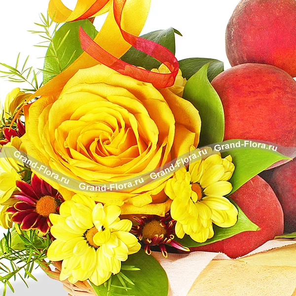 Стандартный: роза желтая - 1 шт., хризантема желтая кустовая - 1 шт., хризантема бордовая - 1 шт., рускус - 2 шт., аспарагус - 1 шт., оазис, фетр желтый, бант красно-желтый, корзина средняя, персики - 1,5 кг.