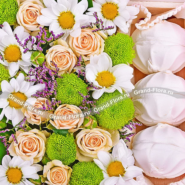 Стандартный: хризантема кустовая зеленая - 2шт., роза кустовая кремовая - 5 шт., хризантема кустовая белая - 3 шт., лимониум(статица) - 3шт., декоративная зелень, зефир, оазис, коробка.